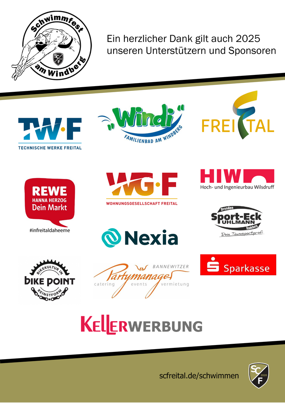 Vom 3. bis zum 5. Juli 2026 wollen wir die 28. Austragung unseres traditionellen Schwimmfestes am Windberg feiern. 1995 wurde das erste Schwimmfest am Windberg mit fünf Vereinen und 80 Gästen ausgetragen. Heute reisen Vereine aus ganz Sachsen und darüber hinaus nach Freital, um mit uns ein schönes und sportlich aktives Wochenende in einem in der Natur gelegenen Freibad zu verbringen. Unser Schwimmfest entwickelte sich bis heute zu einem der größten Nachwuchswettkämpfe in Sachsen. Im Jahr 2018 stellten wir bei der 22. Ausgabe einen neuen Teilnehmerrekord mit über 400 Sportlern und 2300 Starts auf und nach zwei Jahren pandemiebedingten Ausfalls gelang uns nach dem Comeback 2021 ein fulminantes Jubiläum zur 25. Ausgabe im Jahr 2022. In jedem Jahr gilt unser herzlicher Dank allen Unterstützern, ohne die wir diesen großen Wettkampf nicht durchführen könnten.