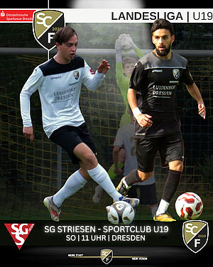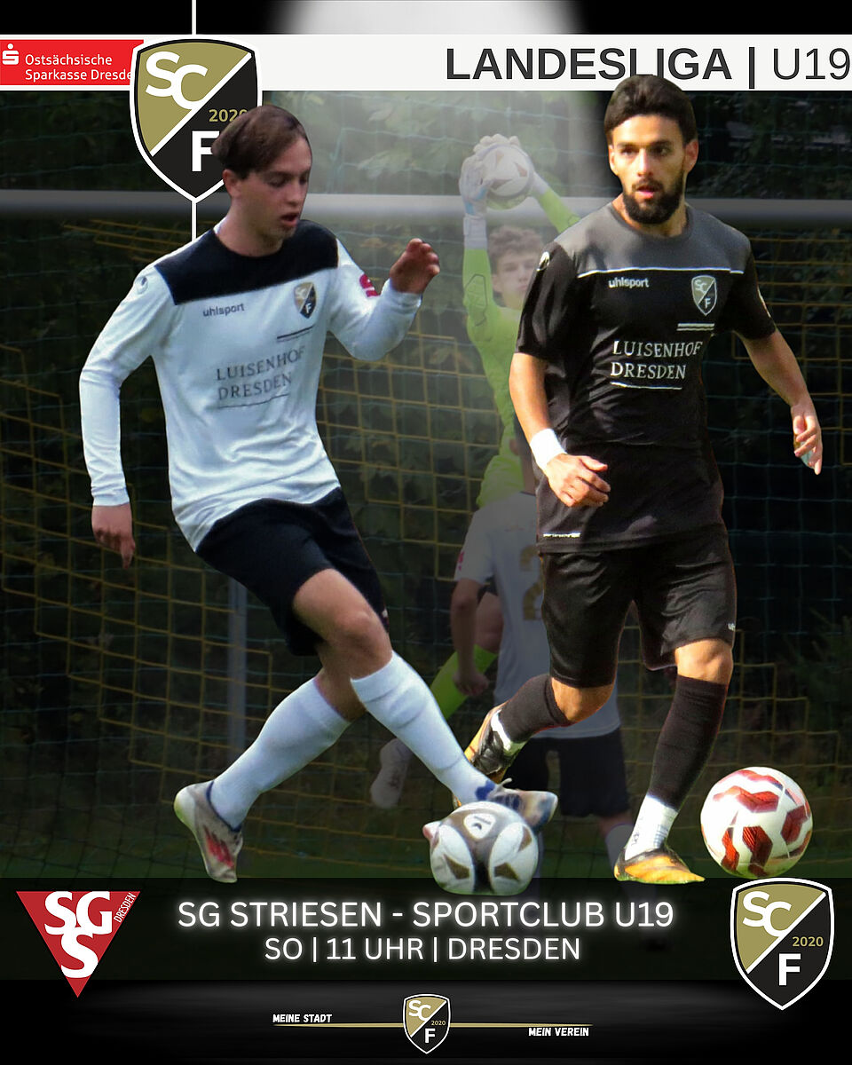 Nach dem Befreiungsschlag am letzten Spieltag gegen Rotation Leipzig ist unsere U19 zum letzten Pflichtspiel des Jahres in Dresden bei der SG Dresden Striesen zu Gast. Gegen den Tabellenletzten muss die Fluß-Elf wieder Mut, Teamgeist und Entschlossenheit zeigen, um zu gewinnen. Auf geht’s Jungs, holt euch die letzten Punkte des Jahres!