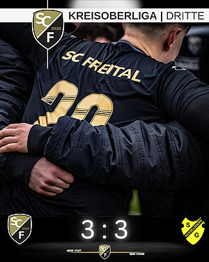 Die Dritte trennt sich mit 3:3 von der SG Kesselsdorf. Ebenso wie unsere U23 traf die Dritte zeitig in der Partie: Justin Dubovsky (11.) brachte die Freitaler früh in Front. Doch in der 22. Minute traf Niclas Wolf zum Ausgleich. Durch die Treffer von Jason Wittek (55.) und Clemens Röhling (63.) in der zweiten Halbzeit lag der SCF nun mit zwei Toren zurück. Doch durch die Treffer von Niklas Pesch (72.) und den Ausgleichstreffer von Florian Braune (78.) sicherte sich die erst einen Punkt gegen die SG Kesselsdorf.