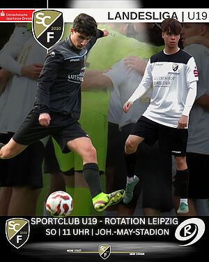 Unsere U19 erwartet nach dem Auswärtsspiel im Leutzscher Holz erneut eine Truppe aus der Messestadt Leipzig. Die SG Rotation Leipzig 1950 wird hierbei am Sonntag um 11 Uhr am Felsen im Johannes-May-Stadion erwartet. Gegen die Leipziger will die Elf von U19-Cheftrainer Sascha Fluß, nach zwei sieglosen Spielen in Serie, endlich wieder punkten. Auch wenn dies harte 90 Minuten werden, ist das Motto klar: Volldampf und alle füreinander!