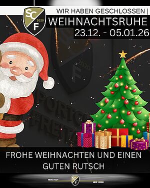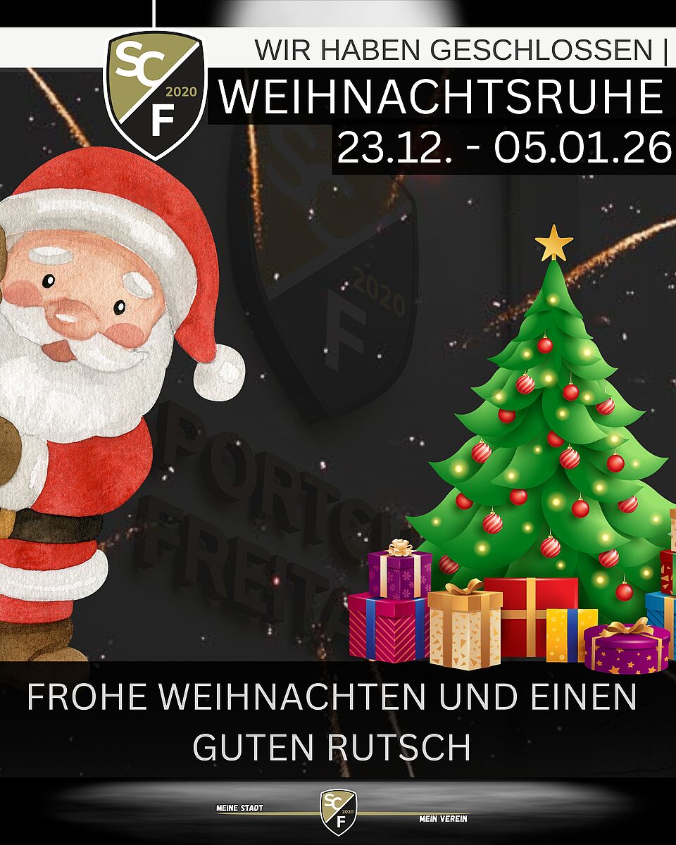 Ab dem 5. Januar 2026 sind wir sowohl persönlich als auch telefonisch wieder für alle Belange erreichbar. Der Sportclub Freital e.V. wünscht allen Mitgliedern, Übungsleitern, Fans und Unterstützern ein frohes Fest und einen guten und gesunden Rutsch ins neue Jahr 2026!