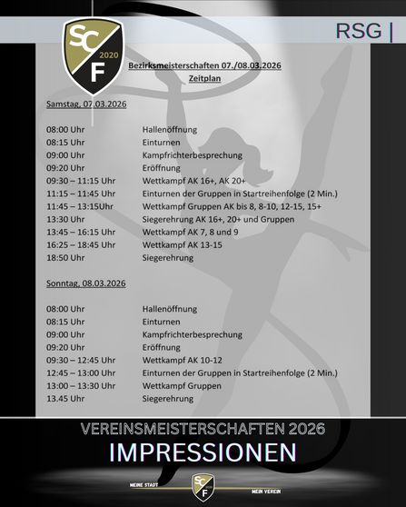 Am 07. und 08. März finden nun die Bezirksmeisterschaften in der Aachener Straße 10 in Dresden statt. Der Wettkampf beginnt 9:30 Uhr mit den Mädchen der Altersklasse 16+. Über Fans des SC Freital würden sich die Mädchen sicher sehr freuen, denn es geht um die Qualifikation zu den Sächsischen Meisterschaften. Den gesamten Zeitplan der Bezirksmeisterschaften gibt's im Anhang.